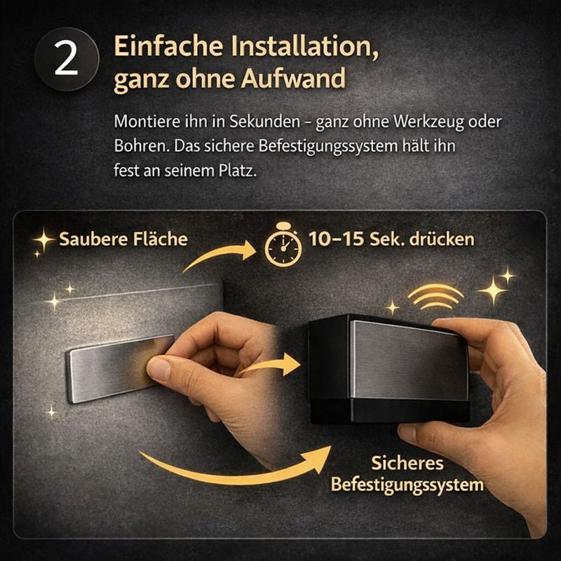 Montiere ihn in Sekunden – ganz ohne Werkzeug oder Bohren. Das sichere Befestigungssystem hält ihn fest an seinem Platz und ermöglicht es dir, deinen Raum schnell und mühelos aufzuwerten.